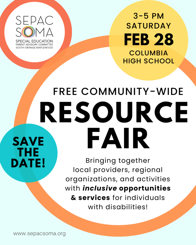 Save the date for our 3rd Annual SEPAC SOMA Resource Fair! Stop by to connect with local therapists, groups and organizations in the South Orange-Maplewood area who provide inclusive opportunities and services to individuals with disabilities.