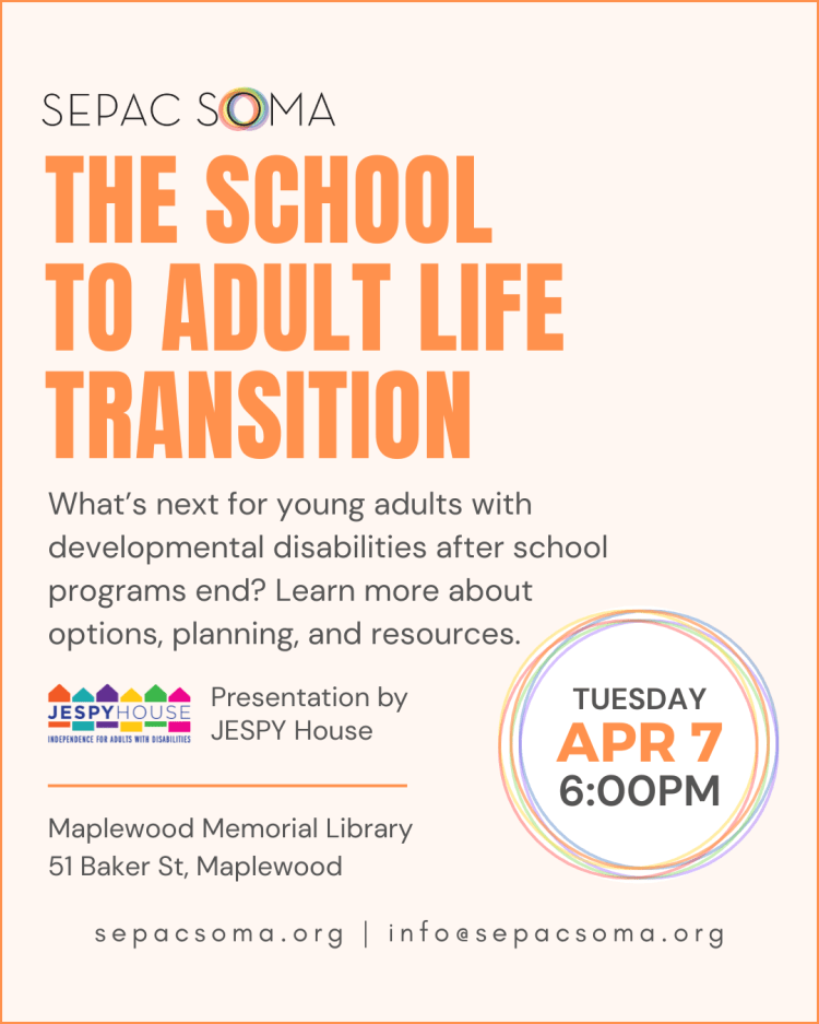 Learn about the transition to adult life after high school or an 18-21 program. Housing, employment, recreational services … what’s next? JESPY House, a local provider based in South Orange, joins us to share info about planning, options, and resources for youth with developmental disabilities and their parents.