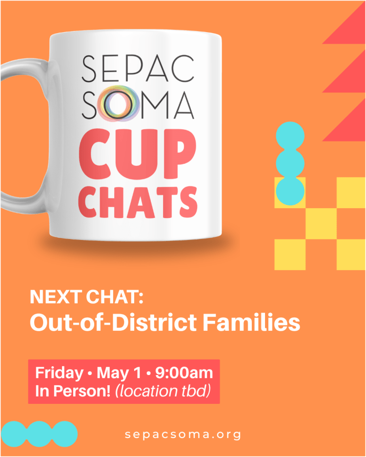 Save the date for our next Cup Chat exclusively for parents and caregivers of neurodiverse students with an out-of-district placement, whether it’s through SOMSD, unilateral, or private.