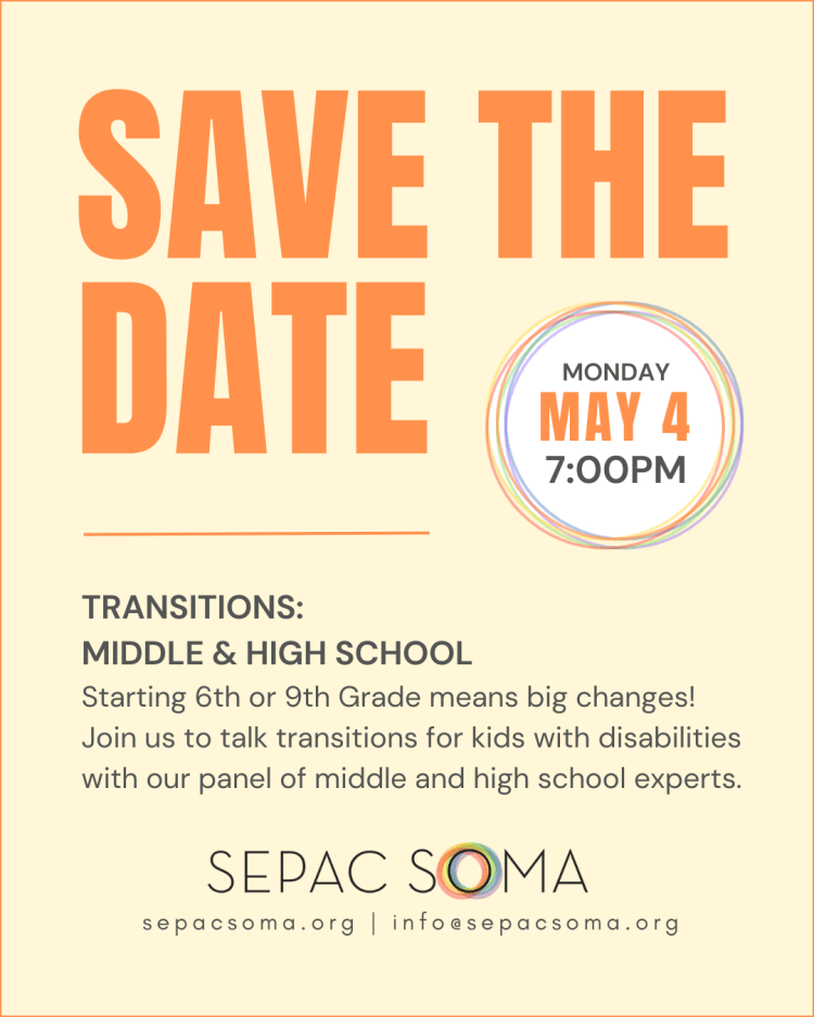 Starting 6th or 9th Grade means big changes! Join SEPAC SOMA to talk transitions for tweens and teens with disabilities with a panel of middle and high school experts.