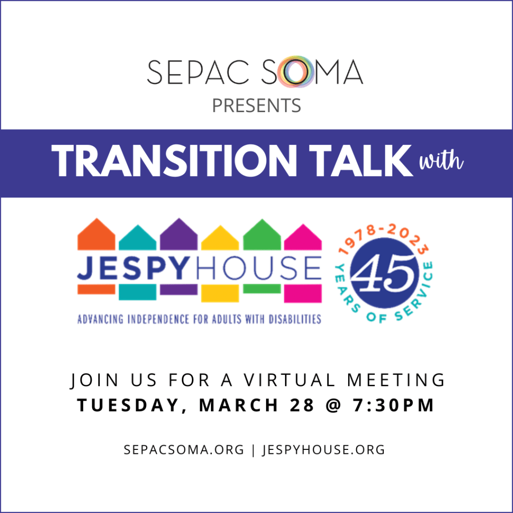 TRANSITION TALK with JESPY HOUSE: SEPAC SOMA proudly presents an opportunity to learn about transition, life after high school and a gem of an organization, JESPY House, located right here in South Orange. JESPY provides employment, housing, and recreational services, and resources to the post-18-year-old disabled population.