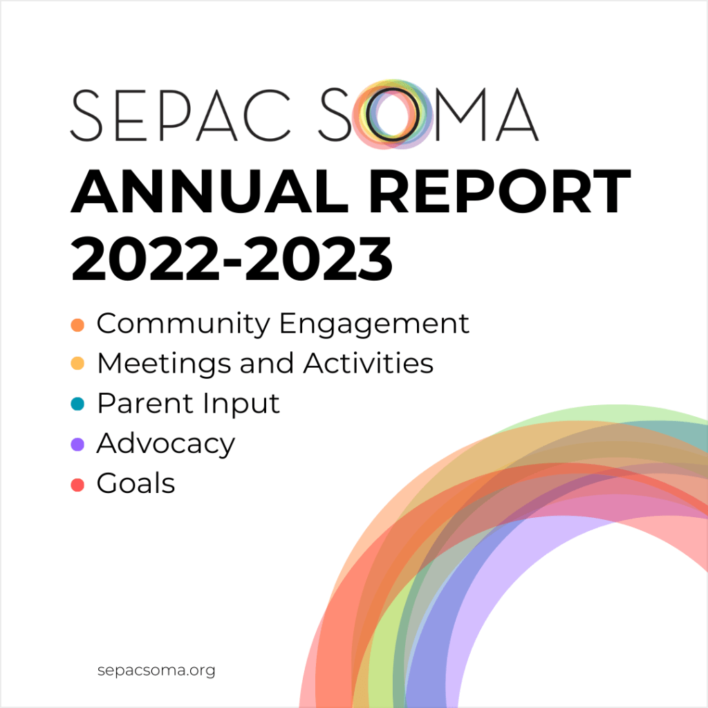 In short, it was a busy year making connections, expanding our reach, sharing information and resources, and advocating to improve the lives of students with disabilities. We hope you’ll take some time to review all that goes into a year in the life of a parent advisory group and consider how you can help support this important work going forward. Any level of involvement – joining us as a board member, school liaison or sub-committee member, attending meetings, providing input through our surveys, or simply spreading the word about SEPAC SOMA to your friends and neighbors − makes a difference!