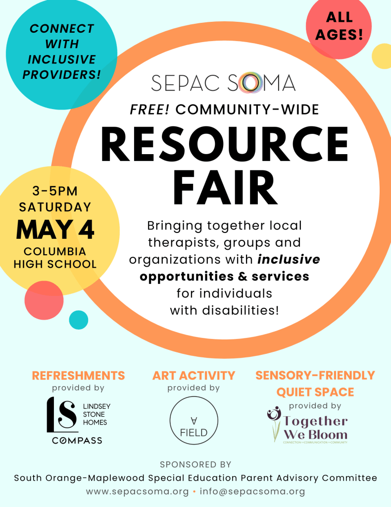 The very first SEPAC SOMA Resource Fair is happening soon! Stop by to connect with local therapists, groups and organizations in the South Orange-Maplewood area who provide inclusive opportunities and services to individuals with disabilities.