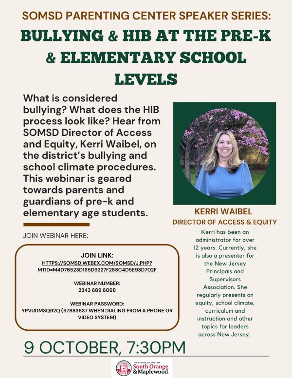What happens when a student is accused of bullying? What happens when it is a student with a disability? What is the expectation for those on the receiving end of a HIB? Join in the conversation on this important meeting to understand and demystify the HIB process, led by our district’s Access & Equity Director, Kerri Waibel.