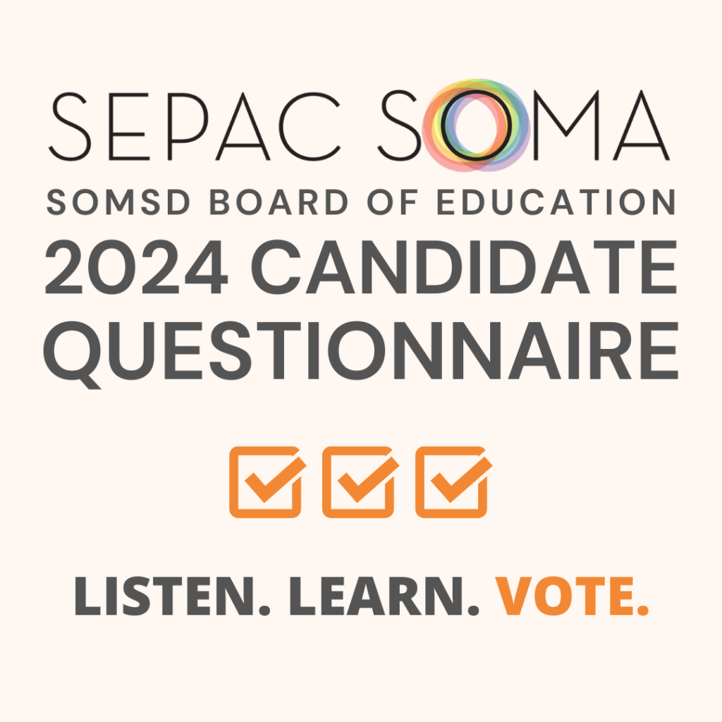 Each year SEPAC SOMA invites SOMSD Board of Education candidates to respond to several questions about issues related to Special Education in our district. We are pleased to share with you the 2024 BOE Candidate Responses to our questionnaire. We thank all the candidates for taking the time to share their perspectives. SEPAC is not a political organization, and it does not endorse candidates in any election. This presentation is intended solely to assist voters by presenting candidate views on issues related to special education. The views expressed are the candidates’ own.
