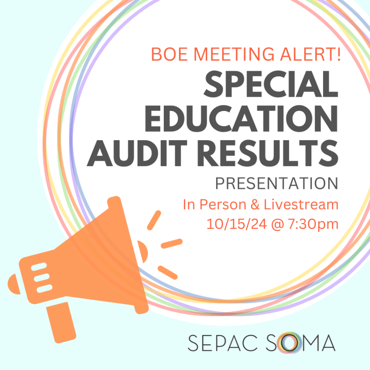 Results of the recent Special Education Audit and recommendations for the district going forward were shared at the 10/15 BOE Meeting. SEPAC SOMA highly recommends reading the full report and watching the meeting recording. Understanding the district’s challenges and goals helps make us better advocates for our children with disabilities. ![]()